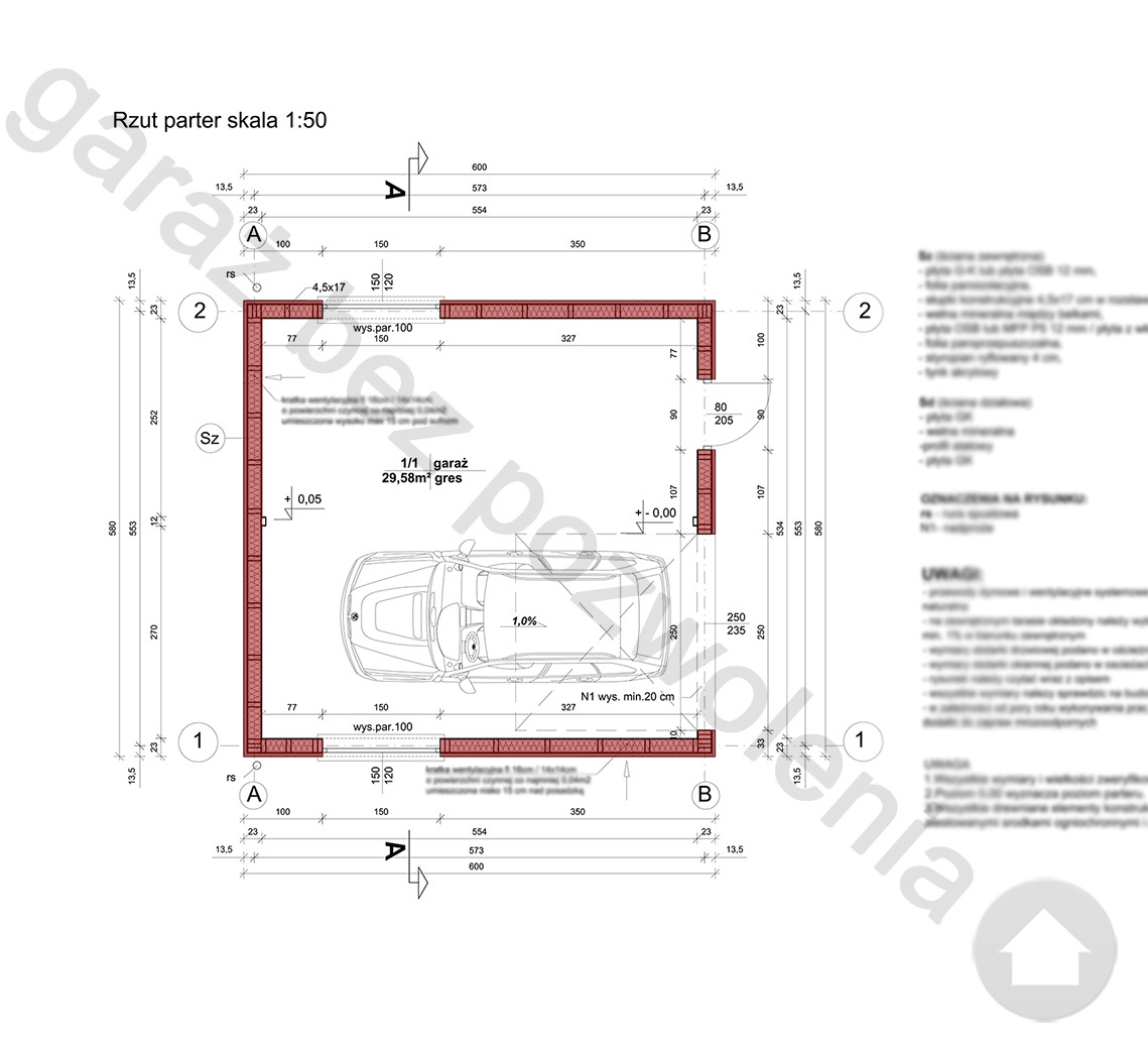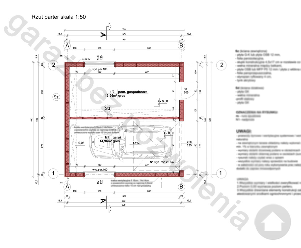 Gotowy projekt Garaż 35m2 - szkieletowy / murowany. Dwustanowiskowy.